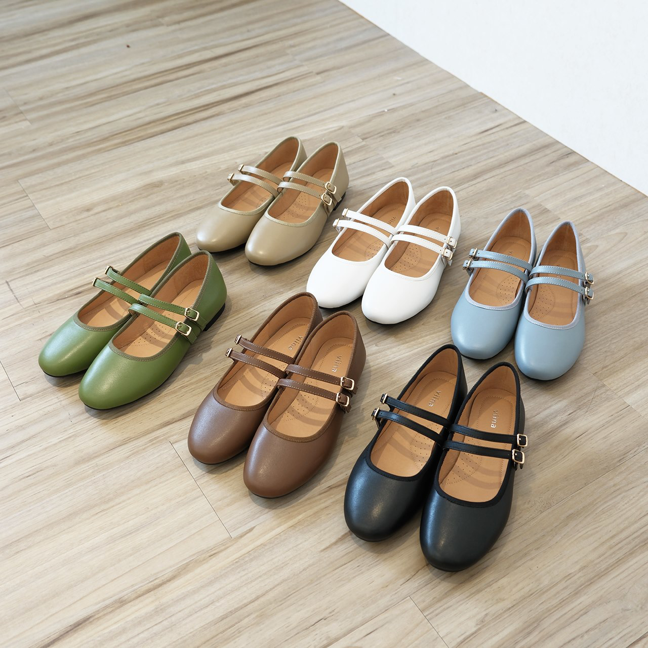 viina 雙細帶全真皮平底瑪莉珍鞋-綠
