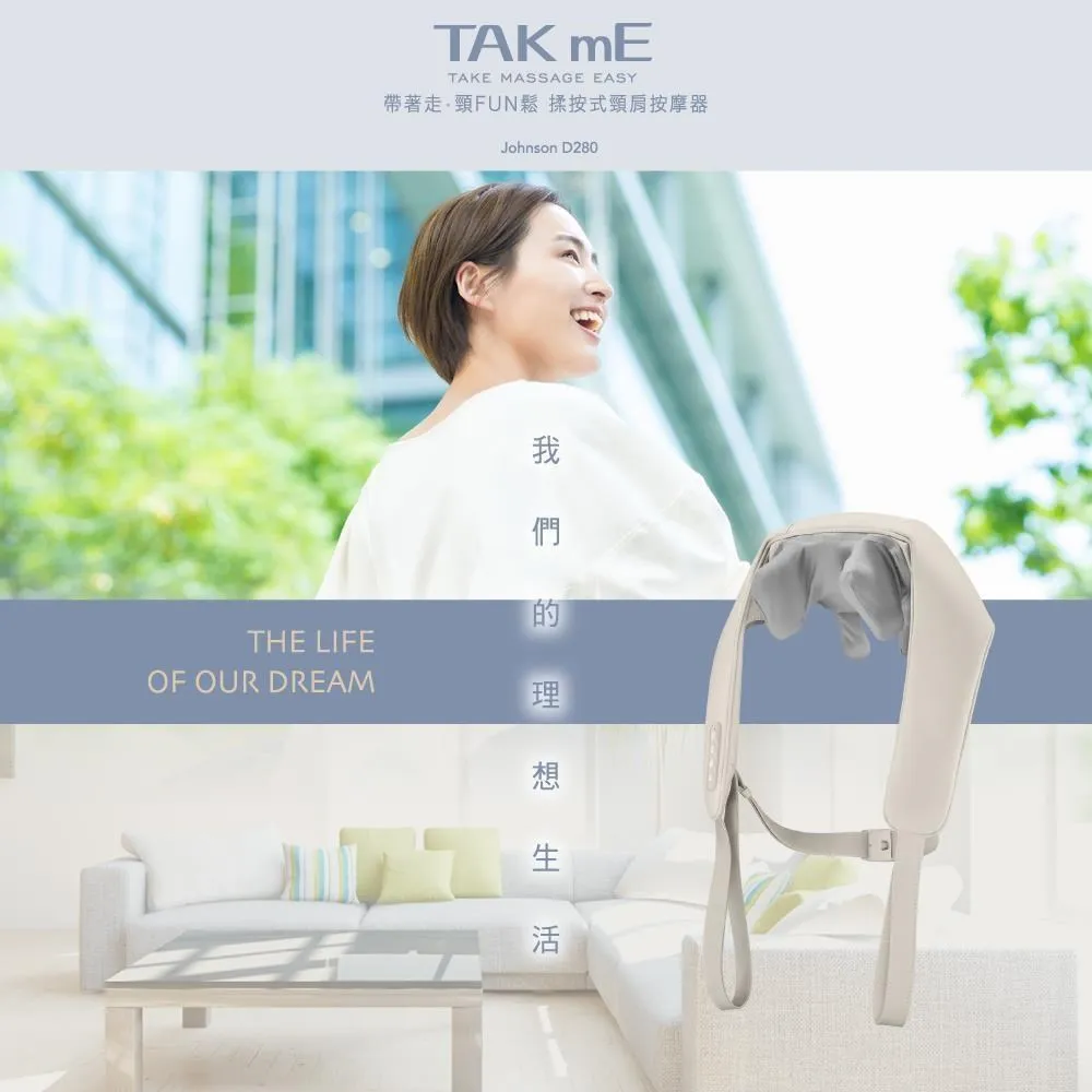 • TAK   FUN鬆揉按式頸肩按摩器產品型號額定電壓額定功率電池容Johnson D280DC 1800mAh預定時間約10分鐘 寸重 量電源供應器約33  17x60公分約1.9公斤100-240V~50/ 0.5AR53481本產品通過經濟部標準檢驗局,安全檢驗合格認證充電3.5小時,視使用情況可持續使用70分鐘。帶著走,隨時盡享按摩舒適享受!備註:1.出廠不附電源供應器,需選擇合產品規格之電源供應器(SELV5V2A)使用,勿使用快充變壓器。2. 充滿電池所需時間:約3.5小時。充滿電後約可使用70分鐘,(最小力度檔次之一般模式)。3. 若產品長期不使用,半年內請對產品進行充電,保持電池活躍狀態。4. 本數據為製造商實驗室於標準環境下之測試結果,電池實際充、放時間,將視使用環境、電池已充/放電次數和所作動的功能等因素而有明顯差異,而使用時間則除了前述原因以外,也將因為用戶所選擇使用時的功能不同而有所差別。5. 本公司保留對產品設計更改及解釋的權利,如有異動恕不另行通知,產品顏色和附件及相關數據等均以實物為準。