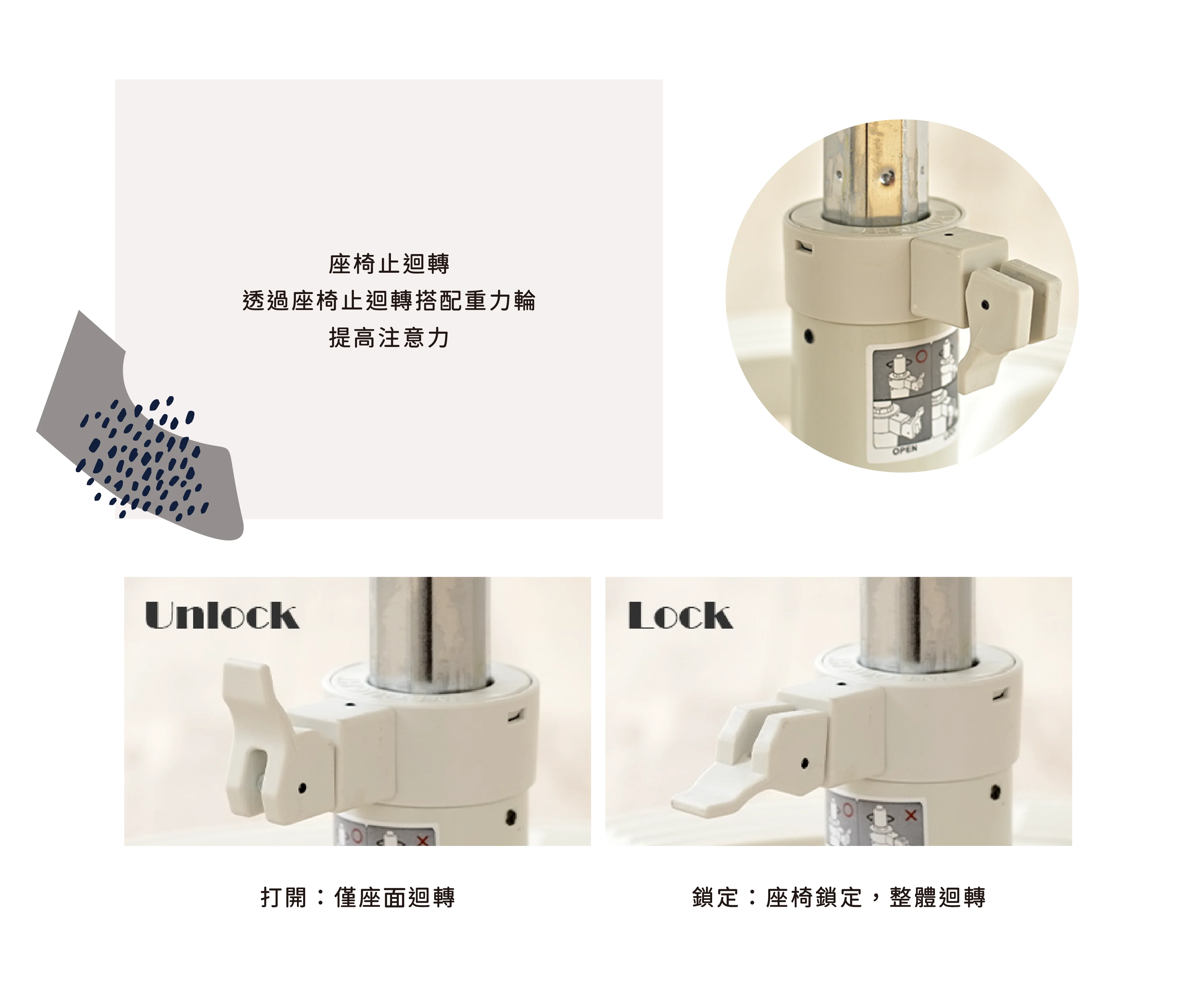 ◎ 座椅採用專利止迴轉氣壓棒,可360度旋轉也可鎖定旋轉
