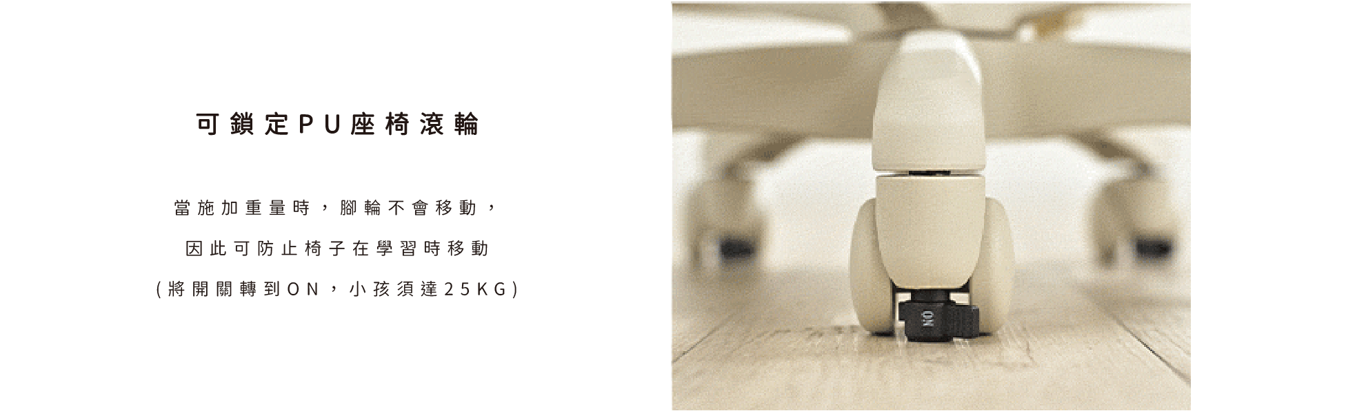 ◎ 可鎖定PU座椅滾輪,煞車制動又安心(將開關轉到ON,小孩須達25KG)