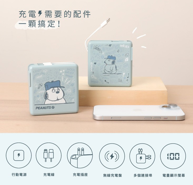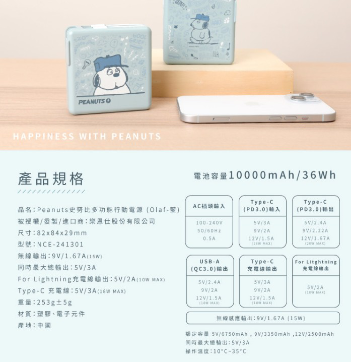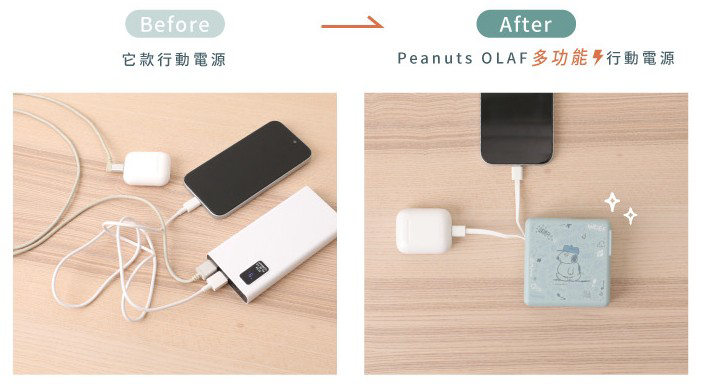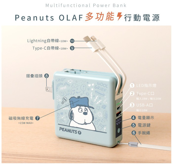 Peanuts OLAF多功能行動電源- Norns Original Design OLAF 歐拉夫 磁吸無線快充10000mAh萬能充 自帶線