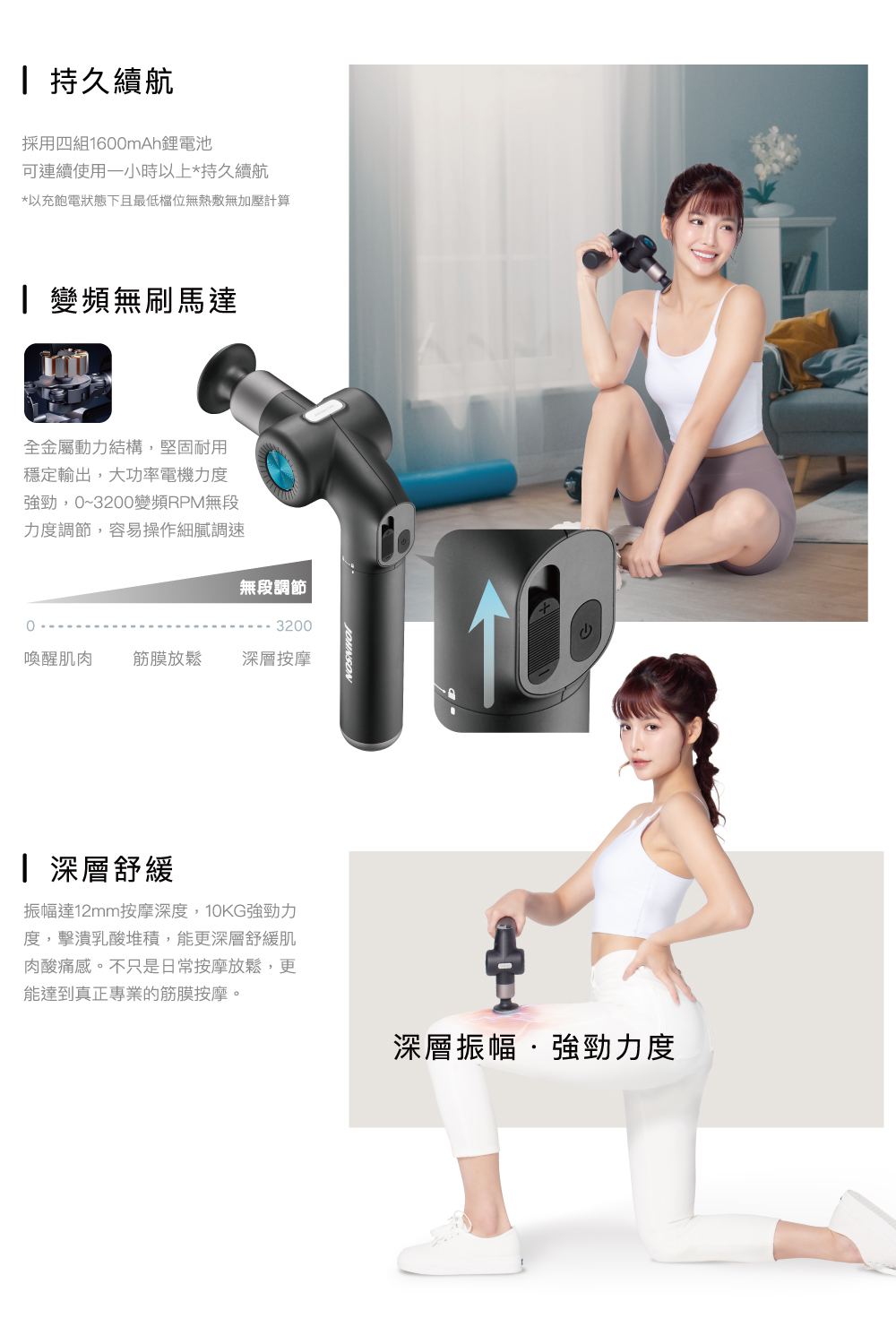 .12mm振福深度、10KG強勁力度,無段調節易操作,深層舒緩肌肉