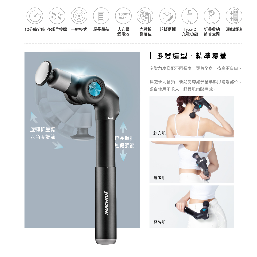 .旋轉折疊臂,可六角度調節,握把可無段調節拉長,按摩更自由,獨自使用不求人
